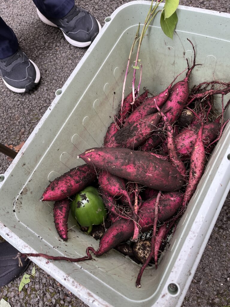 今年は昨年度の反省(苗を欲張って植えすぎました…)を踏まえ少数に絞ったおかげか、大きなサツマイモが収穫でき、患者さん・スタッフ共に「お~!」と歓声があがりました。